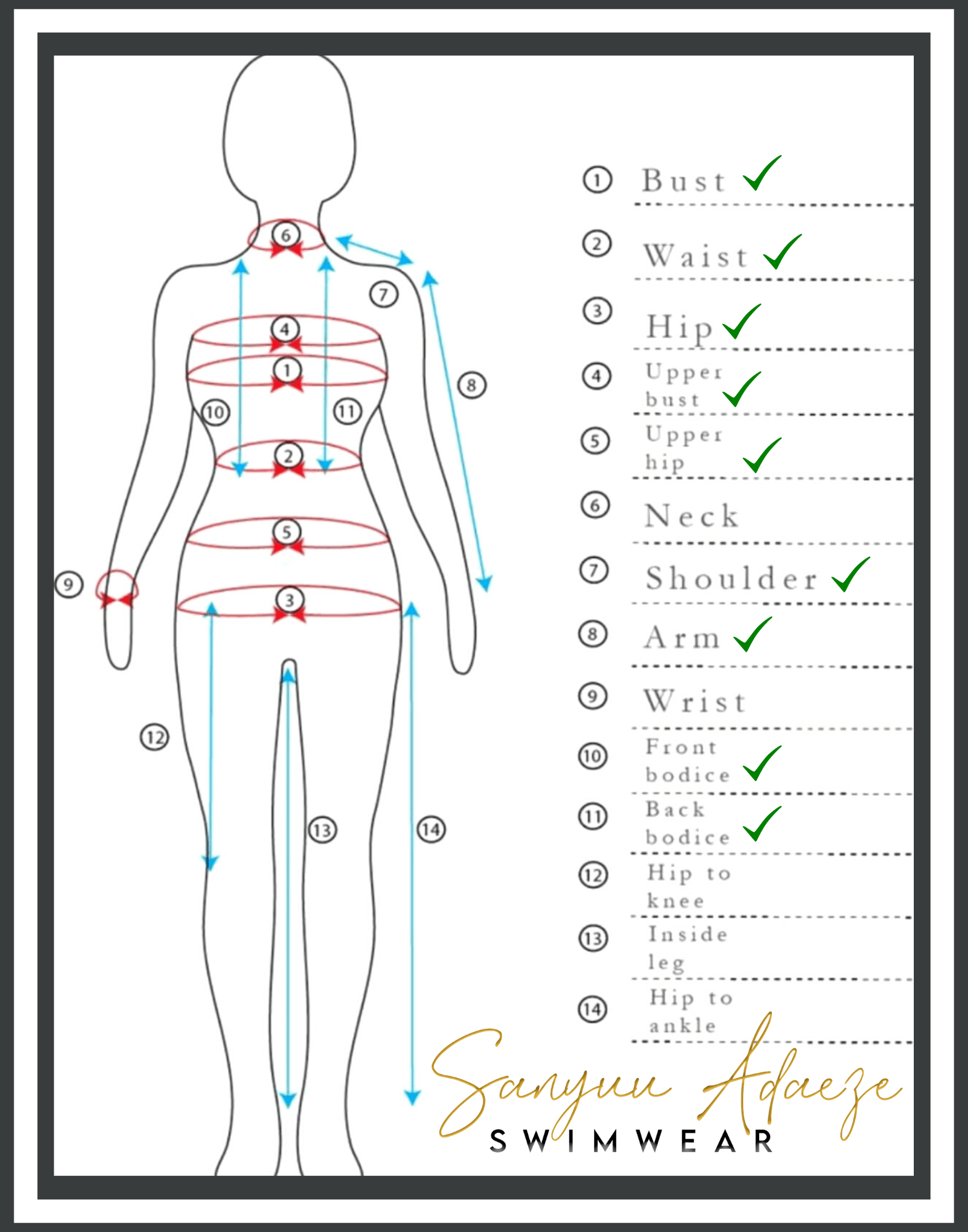 Now that you have provided all measurements needed to fulfill your order, please enter the full amount on the invoice already provided to you by a representative of Sanyuu Adaeze Swimwear and proceed with checkout. Thank you!